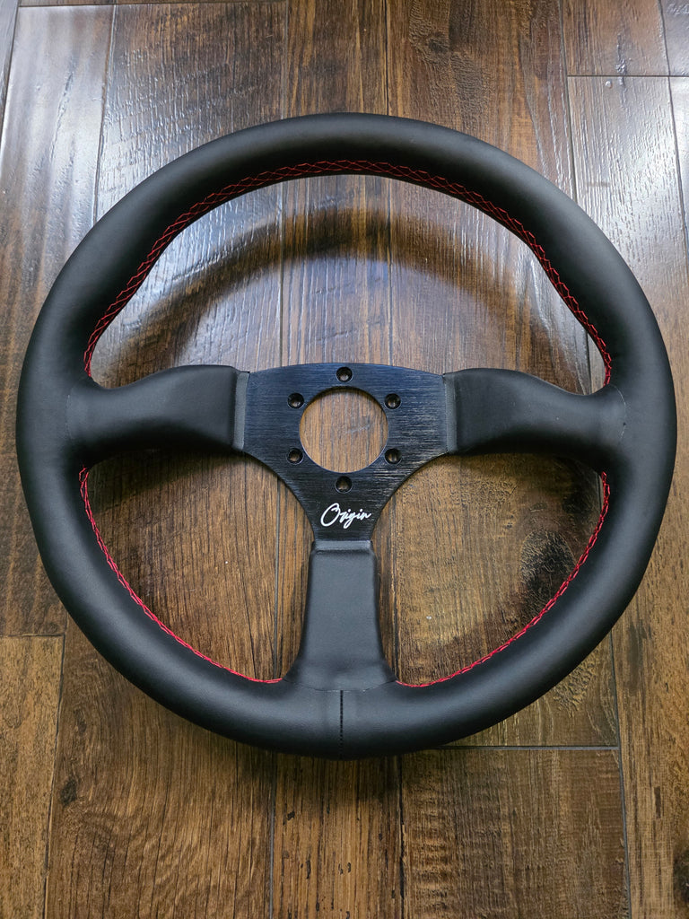 One of a kind hand design black leather steering wheel with red stitch design. This wheel comes with red stitch, black spokes and horn bezel, horn button, screw set and wires. Don't miss your opportunity to to get a one-of-a-kind steering wheel designed by hand from ORIGIN. This item is actually one of a few designed this way.